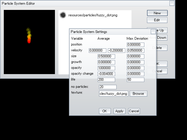 Working on a particle system editor, not completely finished. Palette options still have to be added and a lot of finetuning needs to be done. -gideon